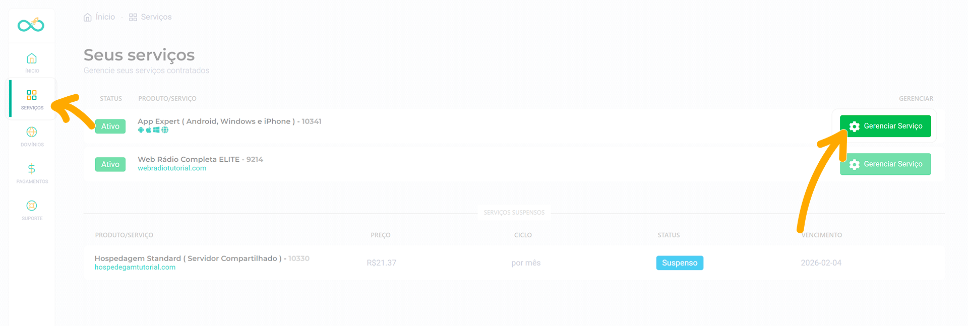 Vá em Serviços → Gerenciar Serviço.