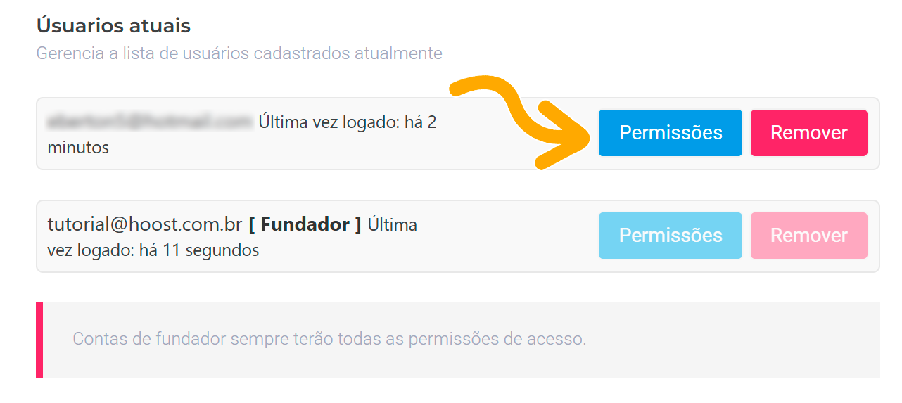 Localize o usuário que deseja alterar e clique no botão “Permissões”.