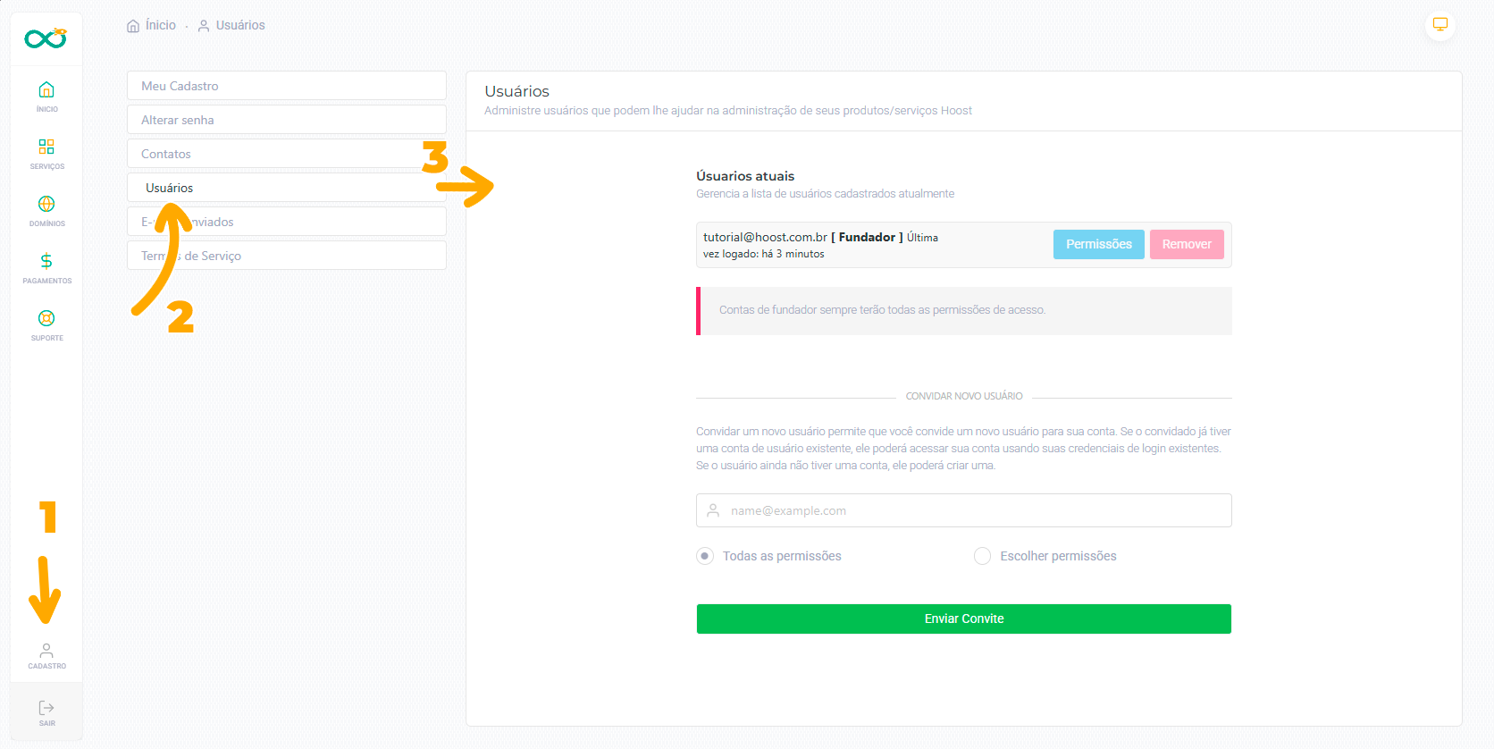 No menu lateral, clique em “Cadastro” e depois em “Usuários” para visualizar todas as pessoas com acesso à sua conta.