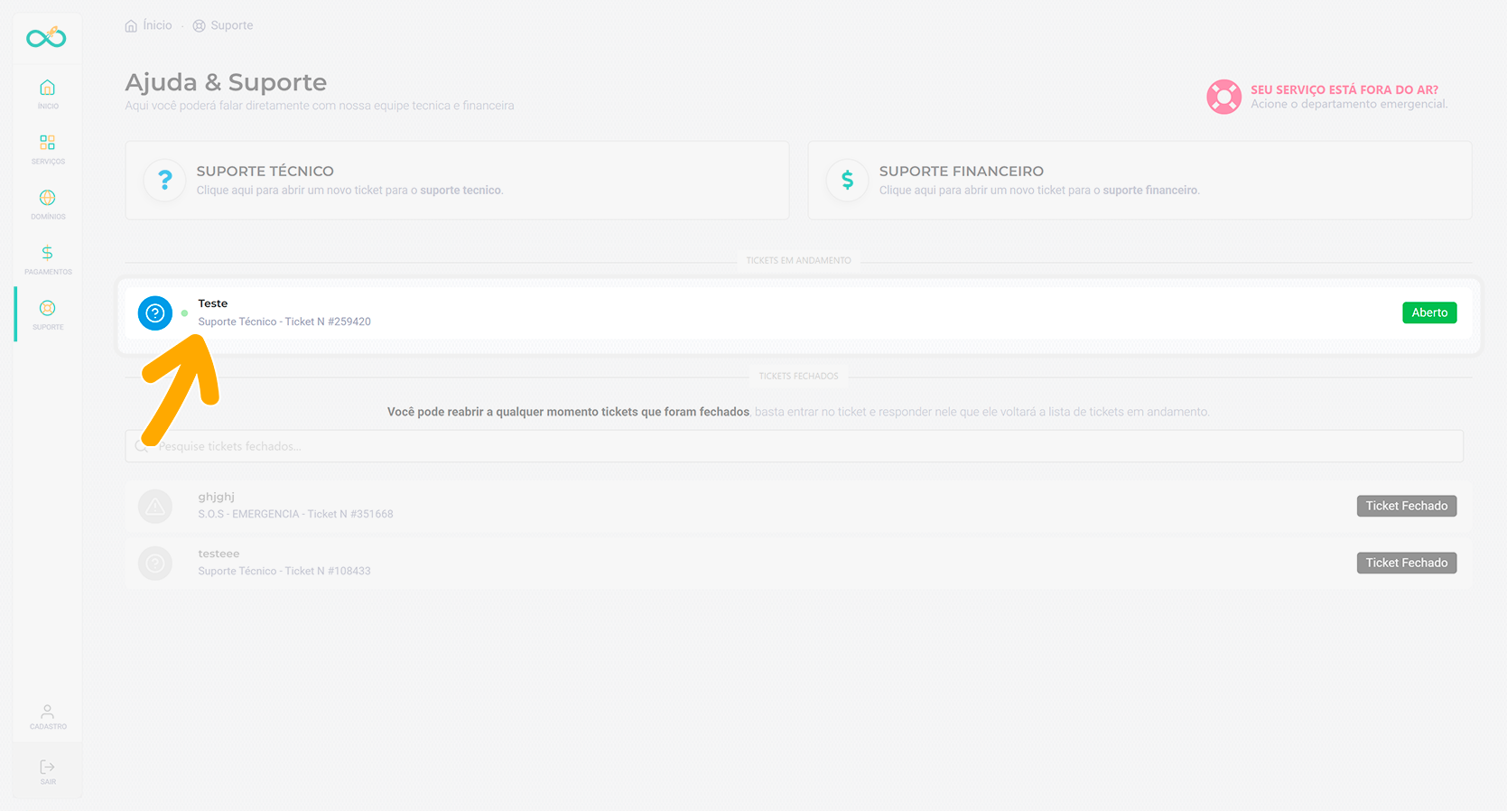 Clique em “Suporte” para visualizar todos os seus tickets.