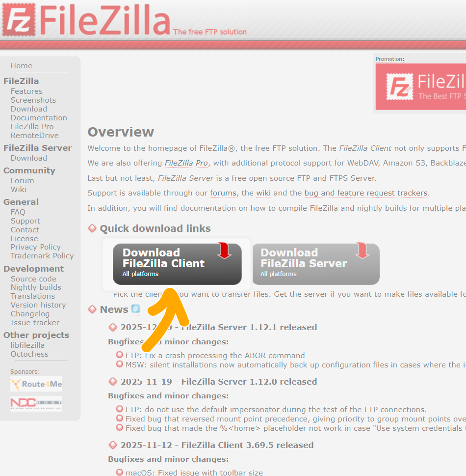 Acesse o site oficial do FileZilla e faça o download da versão mais recente compatível com seu sistema operacional. Em seguida, realize a instalação normalmente.