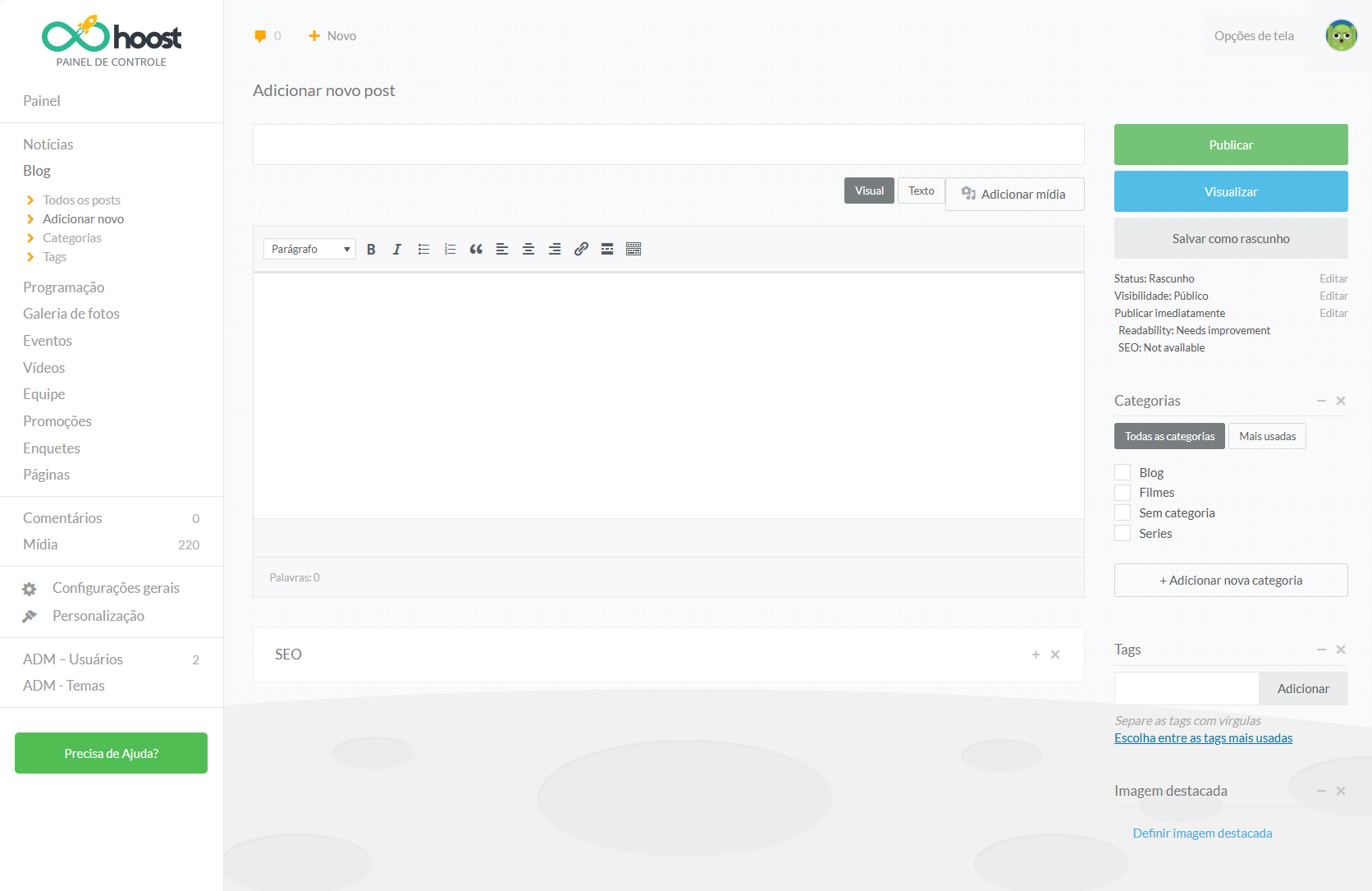 Ao entrar no Blog, você verá as principais opções de gerenciamento dos seus artigos.