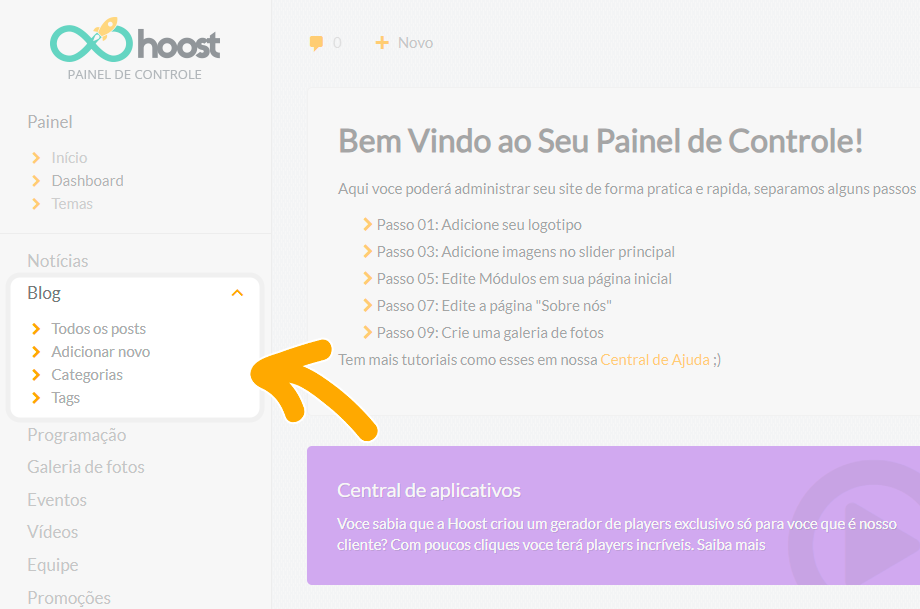 No menu lateral, clique em Blog.