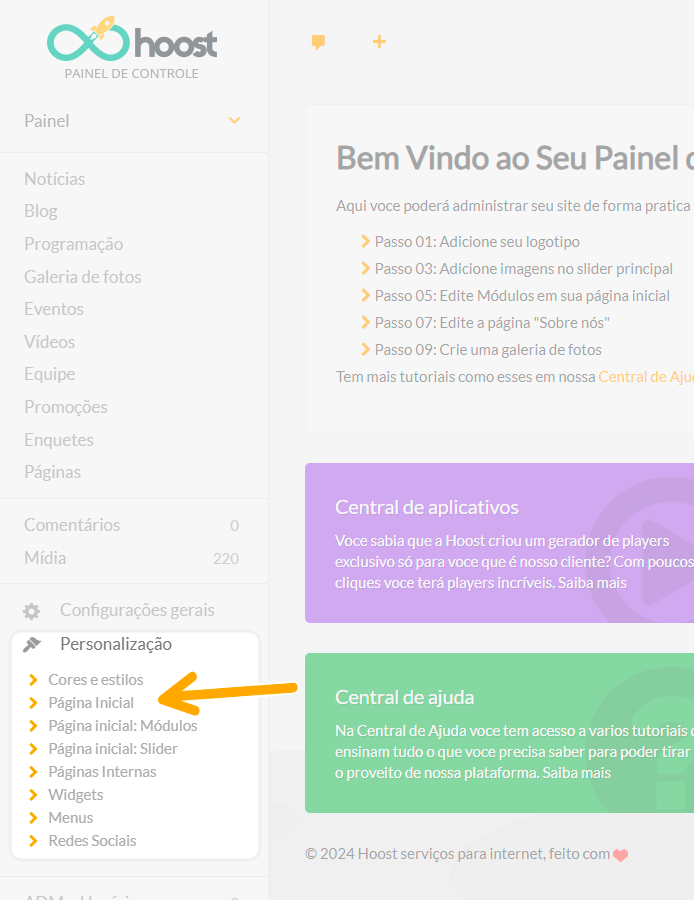 No menu lateral, acesse Personalização → Página inicial.
