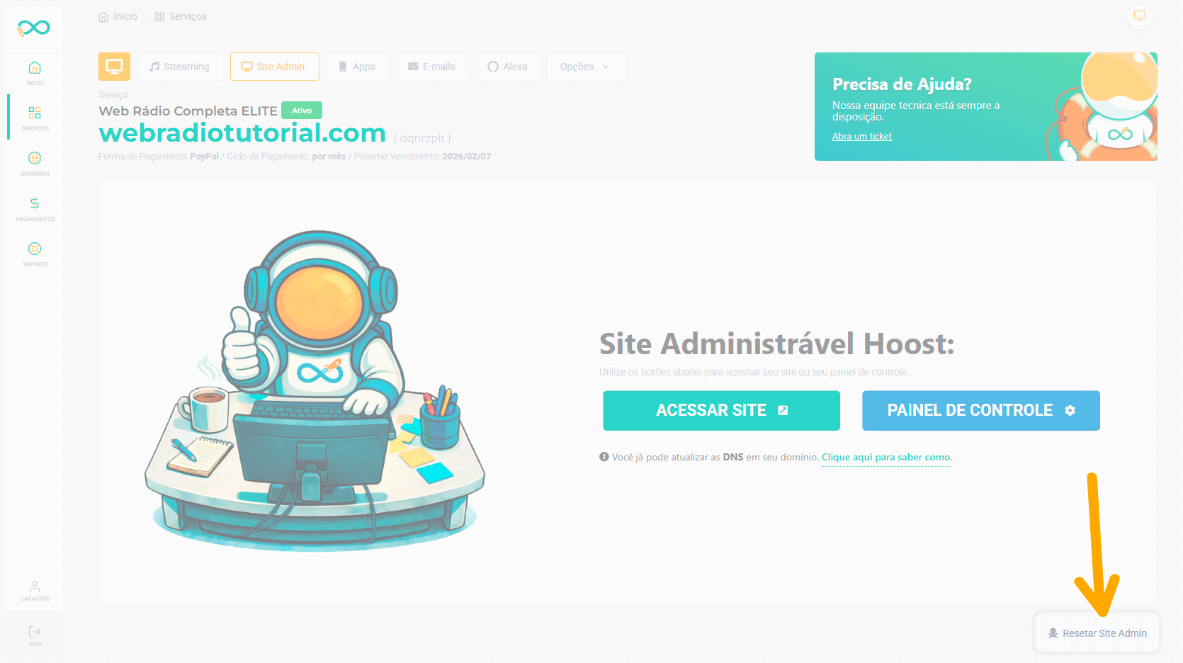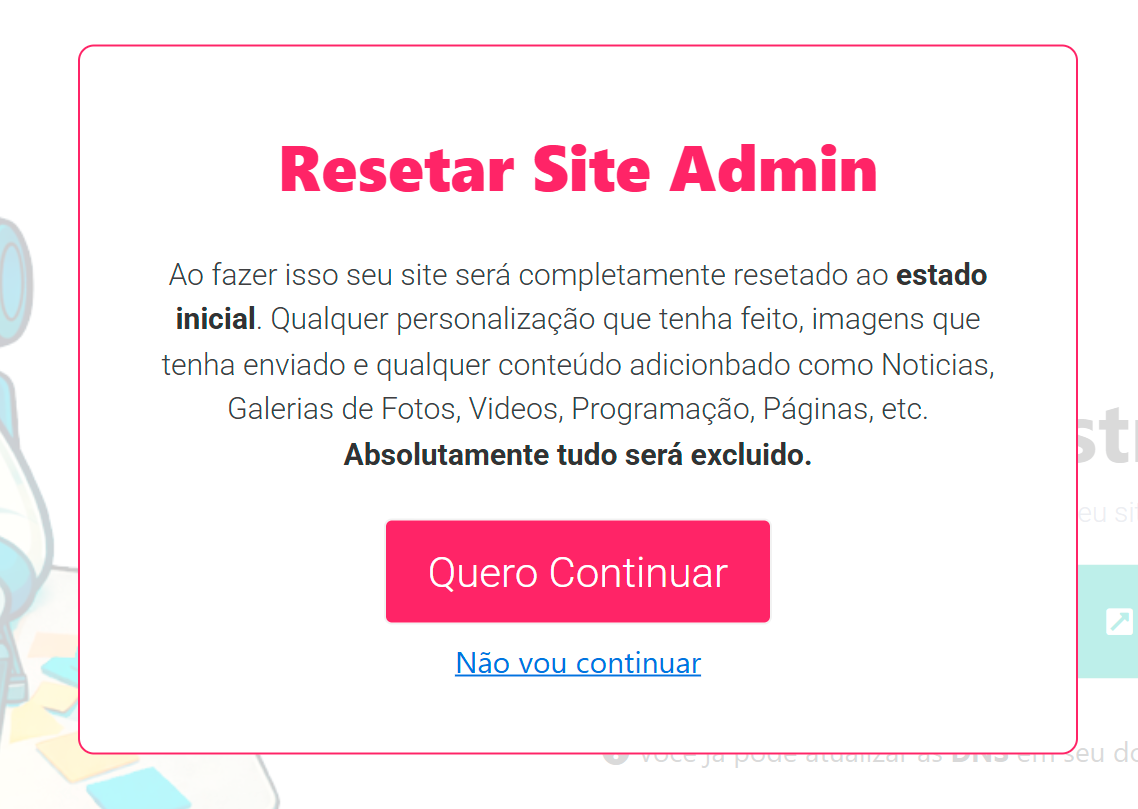 O reset permite reinstalar completamente o seu site, deixando-o como um ambiente novo para uma nova configuração.