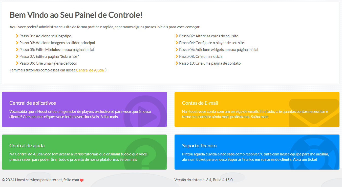 Nele você encontra um resumo rápido das principais ações e atalhos para começar a configurar seu site.