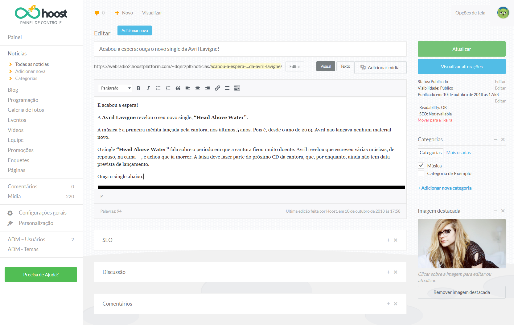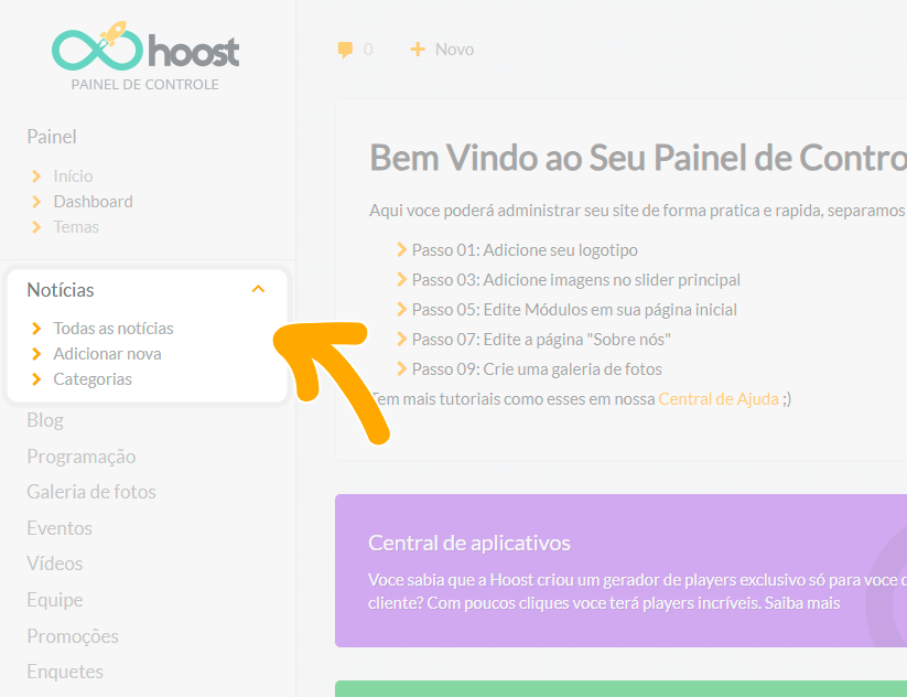 A seção Notícias é usada para publicar conteúdos no site, como avisos, novidades da rádio, lançamentos, matérias e comunicados para os ouvintes.