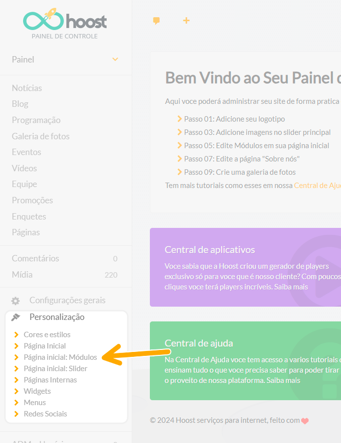 A seção Módulos permite organizar os elementos que aparecem na página inicial do seu site, definindo a ordem de exibição, quais recursos serão utilizados e como cada bloco será apresentado aos visitantes.