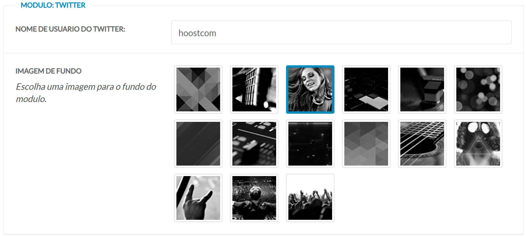 Informe o nome de usuário e escolha uma imagem de fundo para personalizar a exibição do módulo.