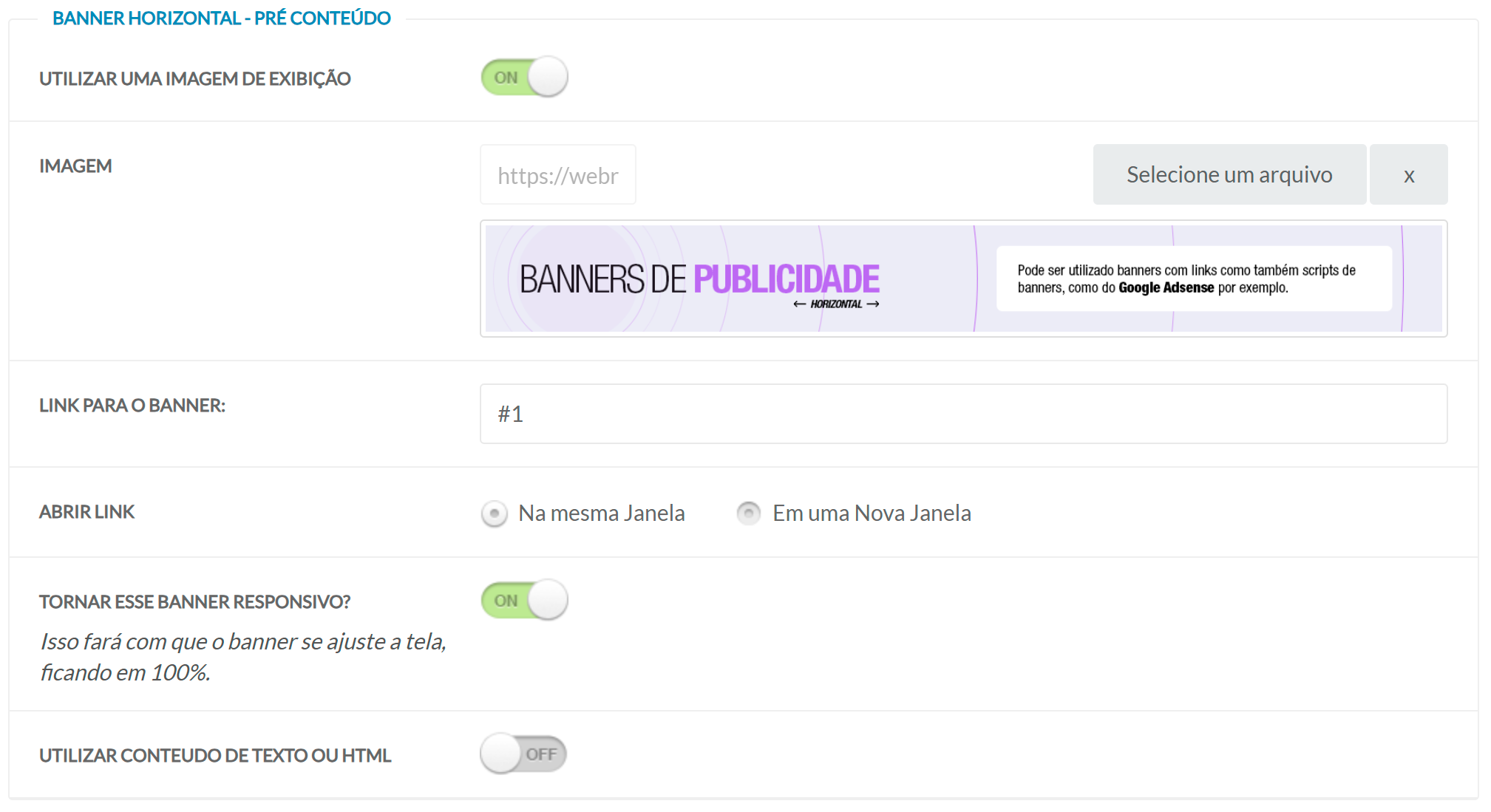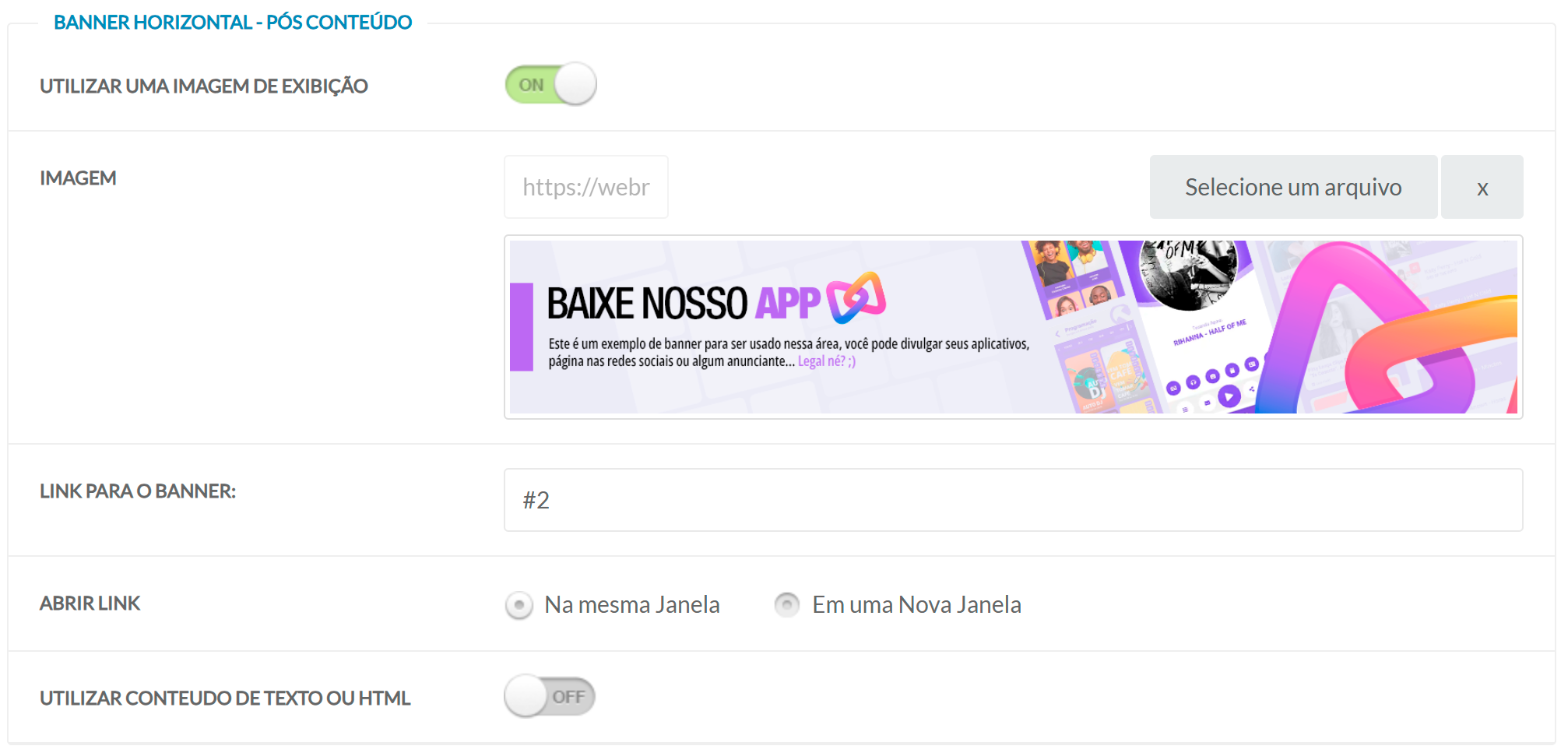 Opcionalmente, você pode ativar Utilizar conteúdo de texto ou HTML para inserir códigos personalizados, como scripts de anúncios.