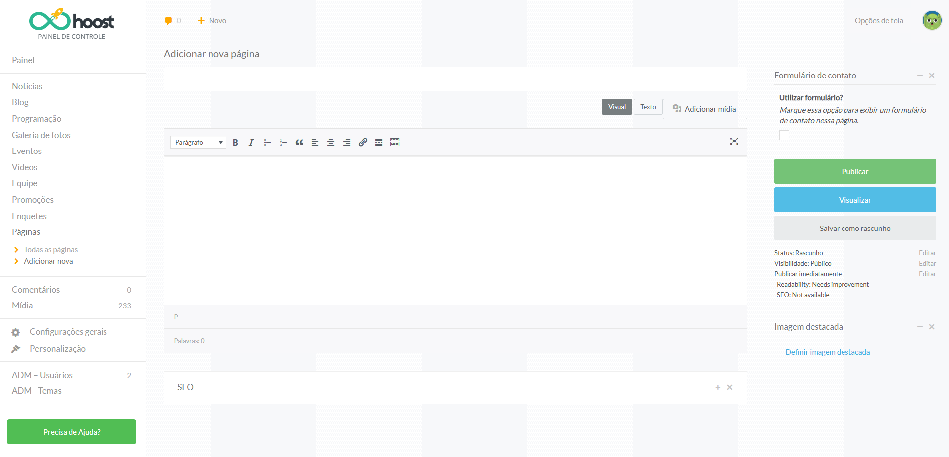 A seção Páginas permite criar conteúdos fixos para o seu site, como por exemplo: