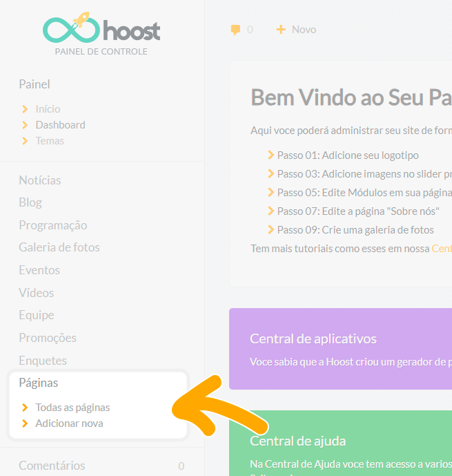 No menu lateral, clique em Páginas.