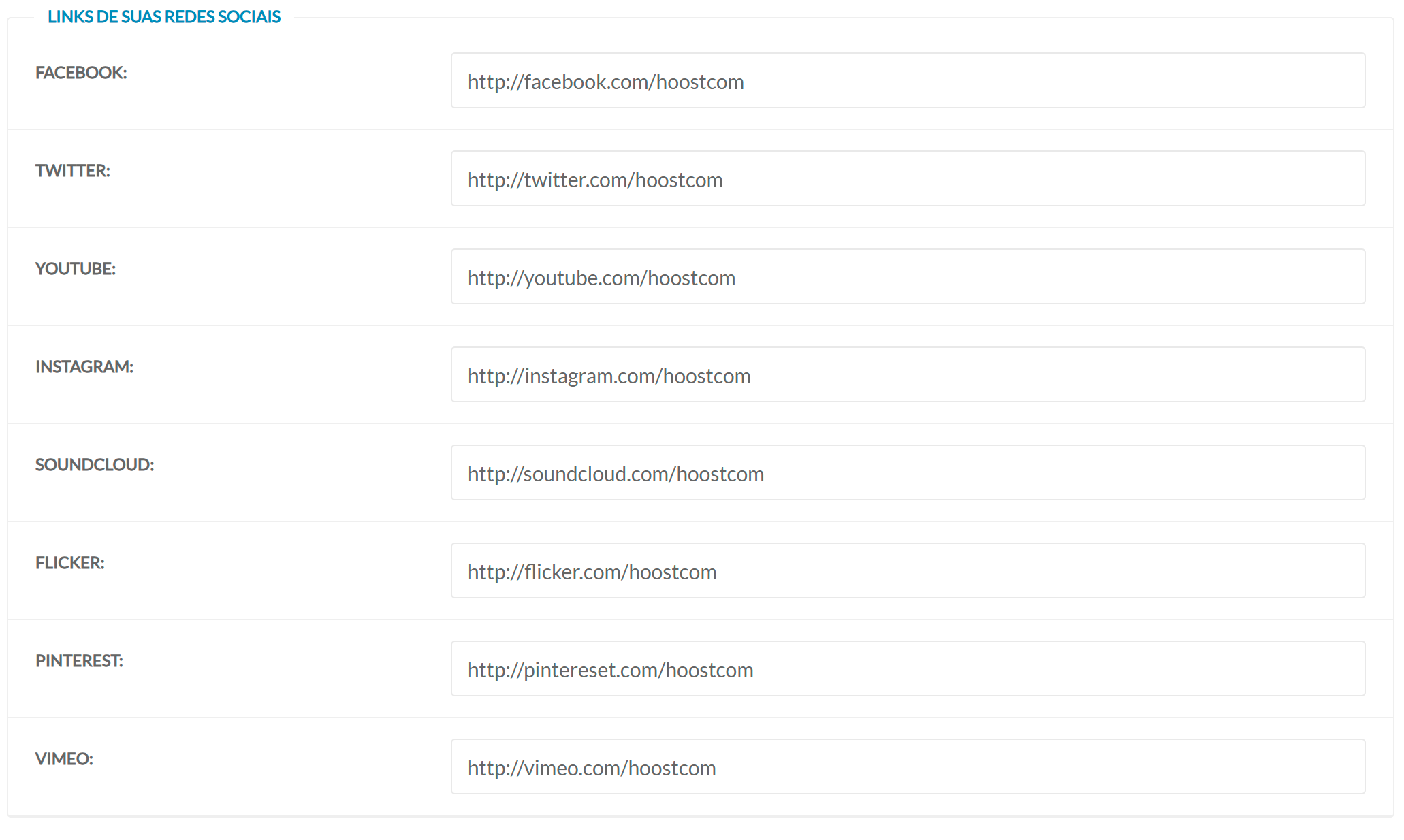 Os widgets que exibem redes sociais utilizam exatamente os links cadastrados aqui.