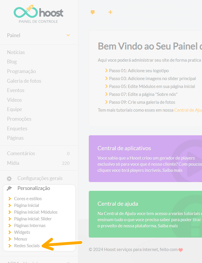 No menu lateral, acesse Personalização -> Redes Sociais.