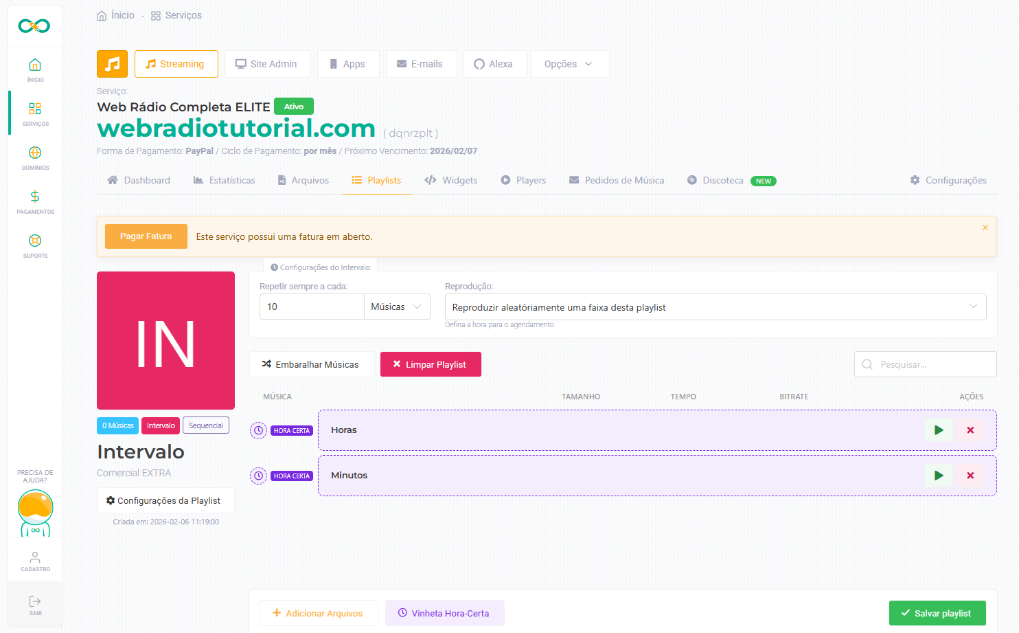 Com a playlist criada, clique sobre ela e localize o botão Vinheta Hora Certa na parte inferior da tela.