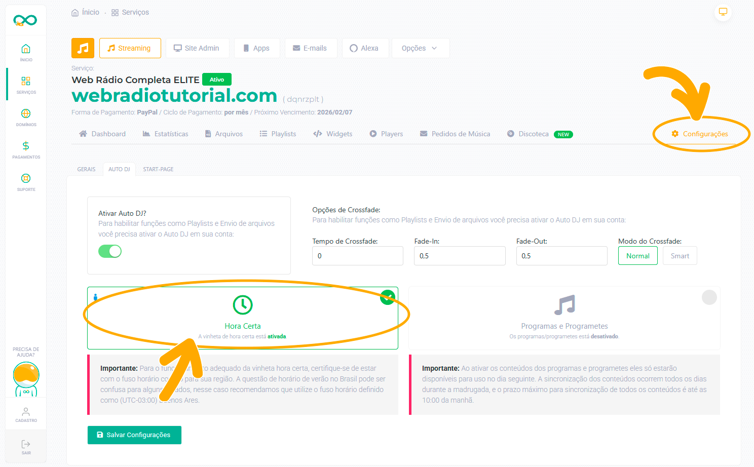 ⚠️ Importante: Antes de ativar verifique se o fuso horário da rádio está correto nas configurações para evitar que os anúncios sejam reproduzidos com horário incorreto.