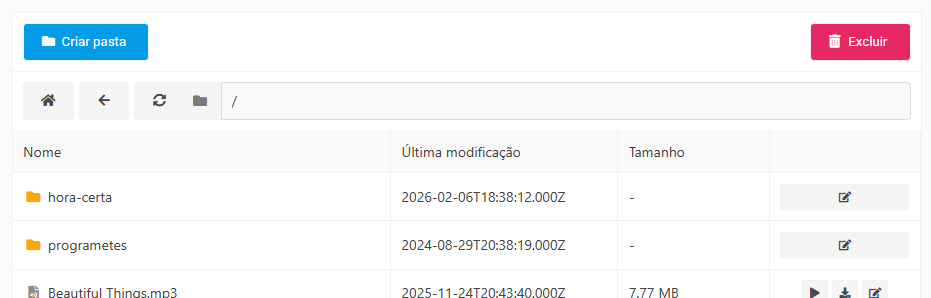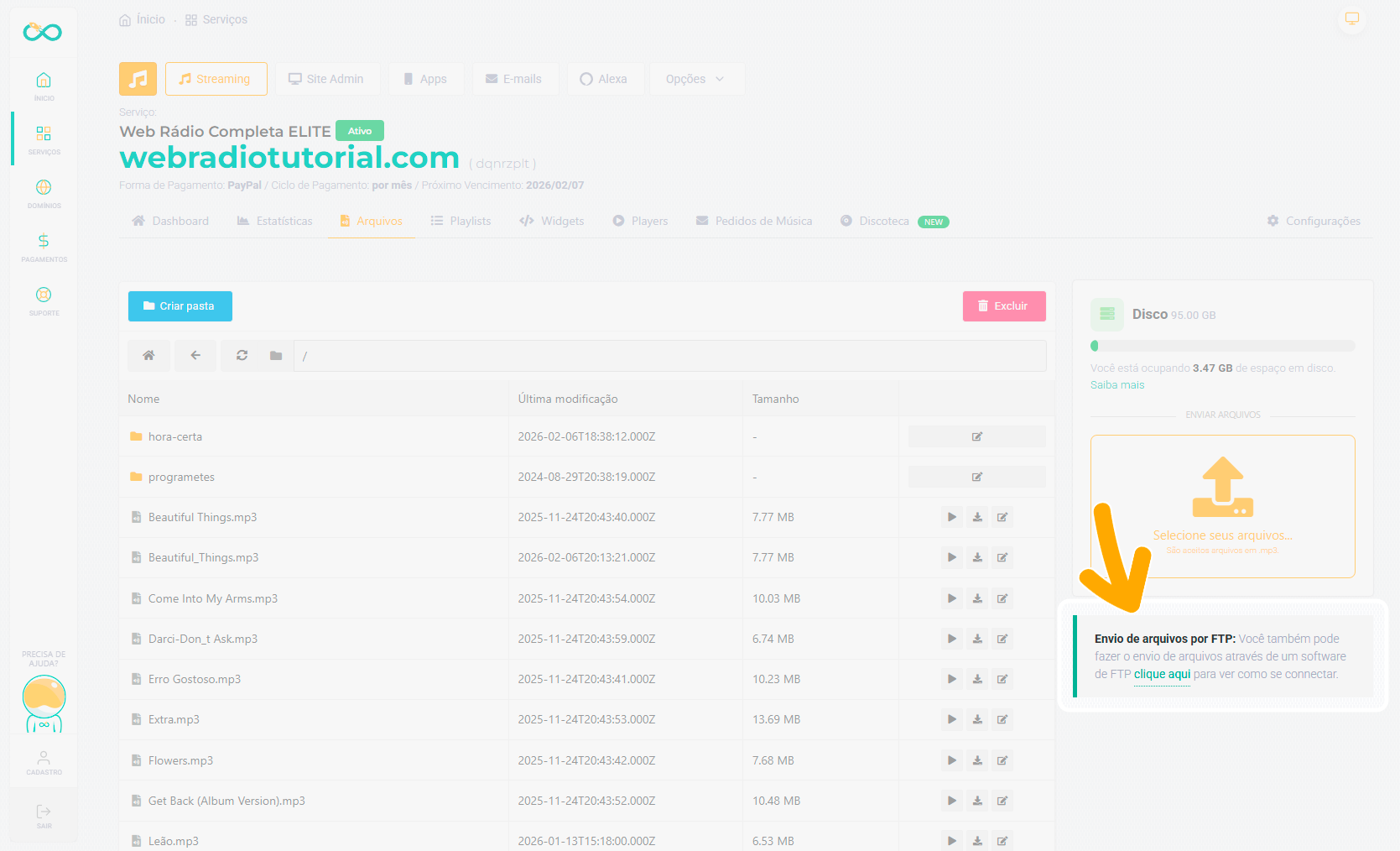 Essa área funciona como um gerenciador onde você pode enviar, organizar, reproduzir e excluir arquivos da sua rádio.