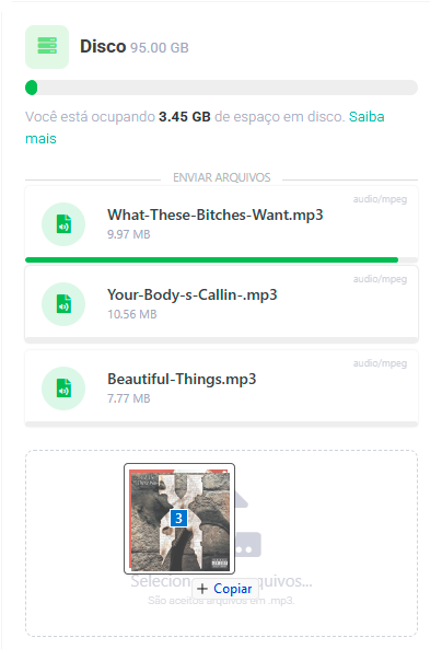 Dentro do gerenciador, localize a área de envio de arquivos e selecione as músicas diretamente do seu computador. Você pode clicar e selecionar ou arrastar os arquivos para a area informada.