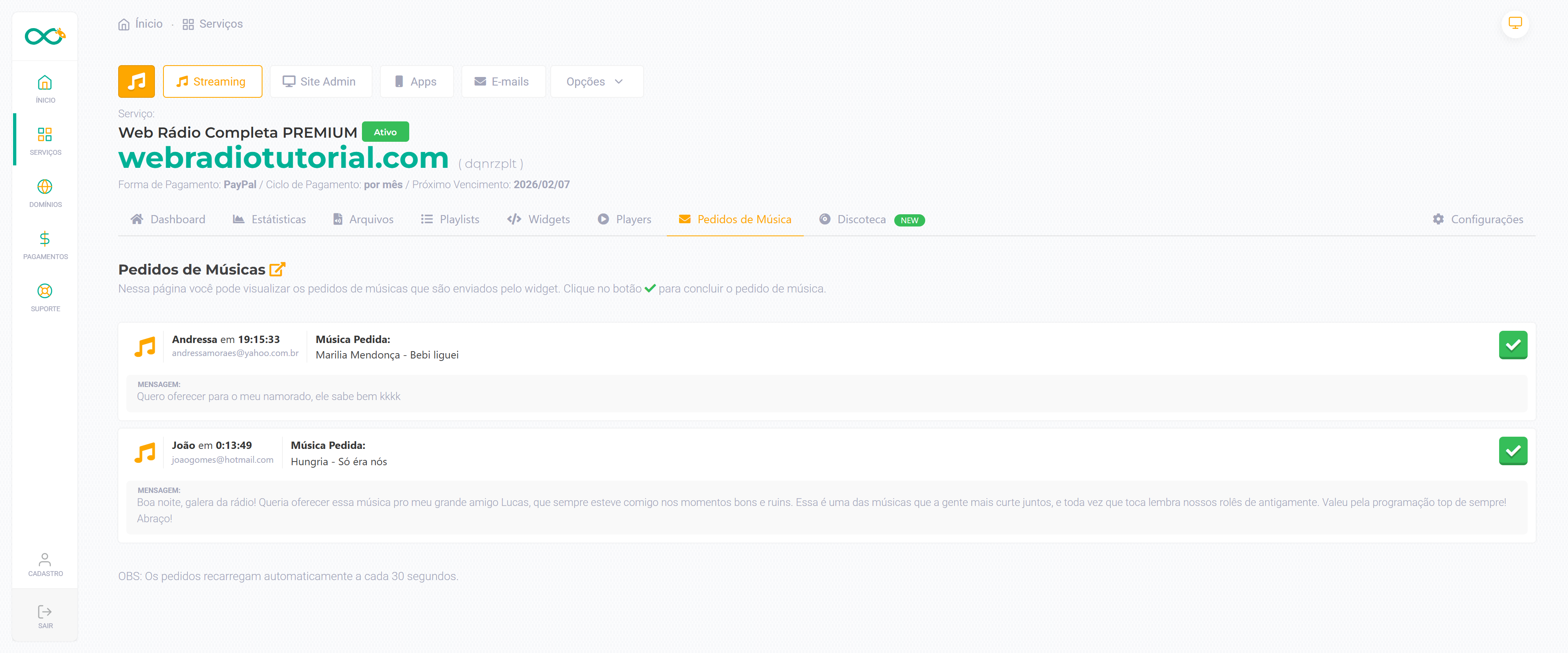 Após atender o pedido (tocar a música ou ler a mensagem ao vivo), clique no botão verde com check (✔) à direita do pedido. Isso irá marcar o pedido como concluído, mantendo sua lista organizada.
