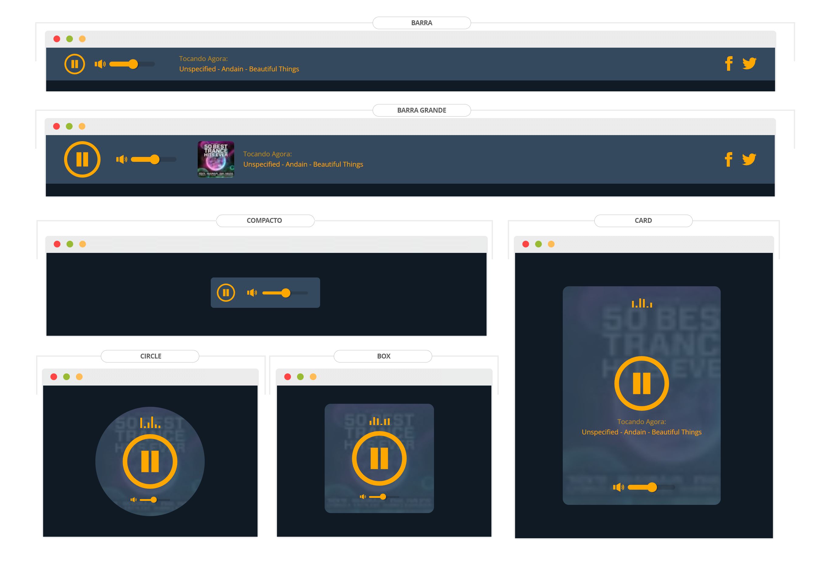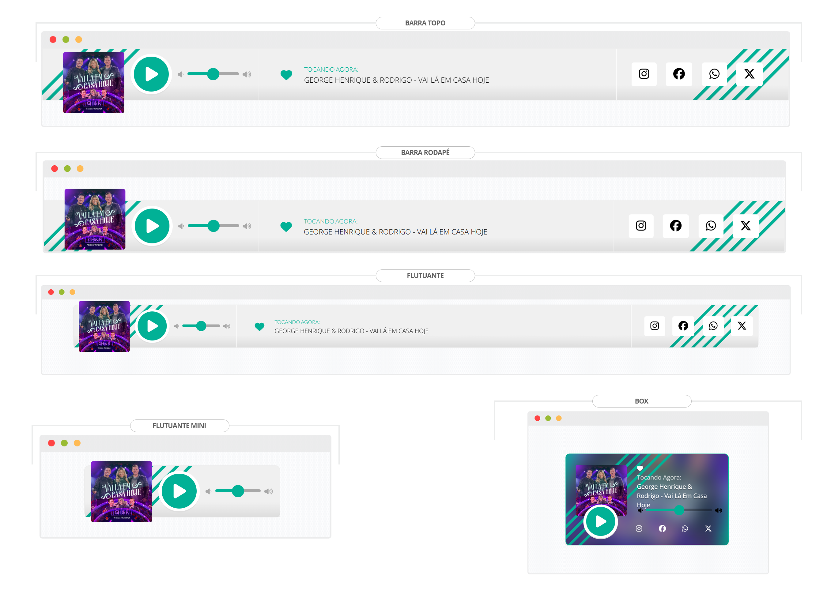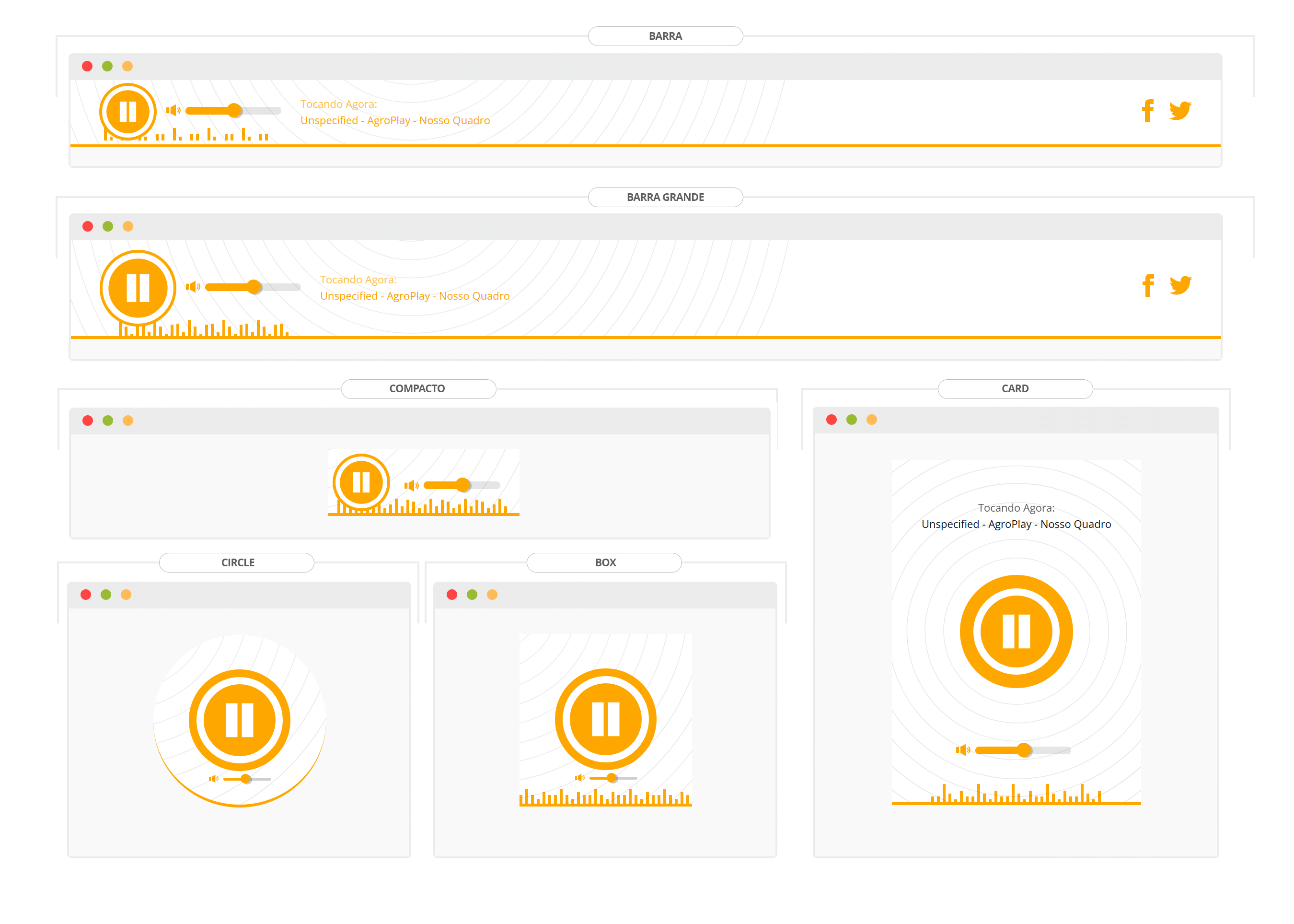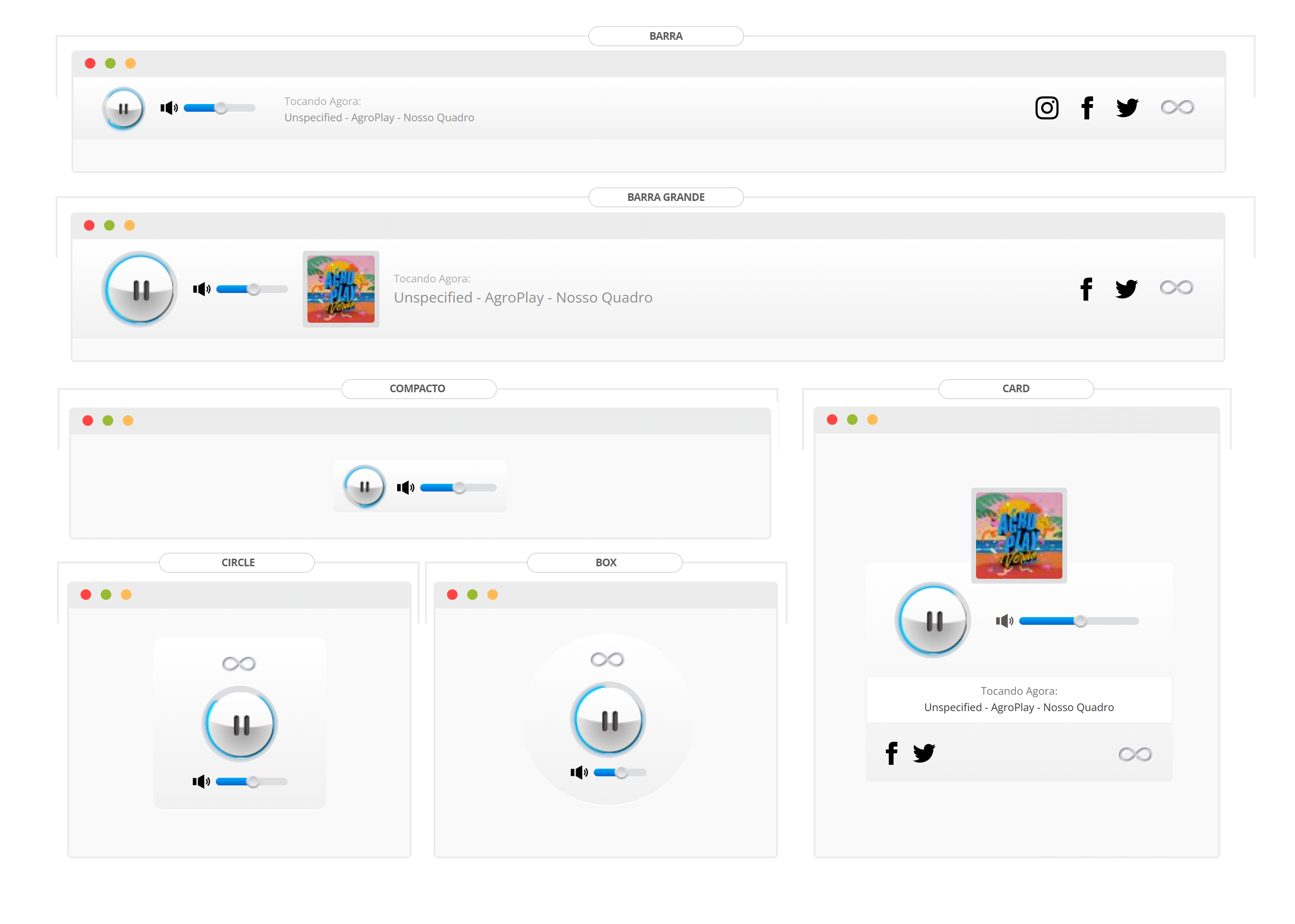 Nos players flats você pode adicionar links de suas redes sociais, também pode definir até 3 cores principais.