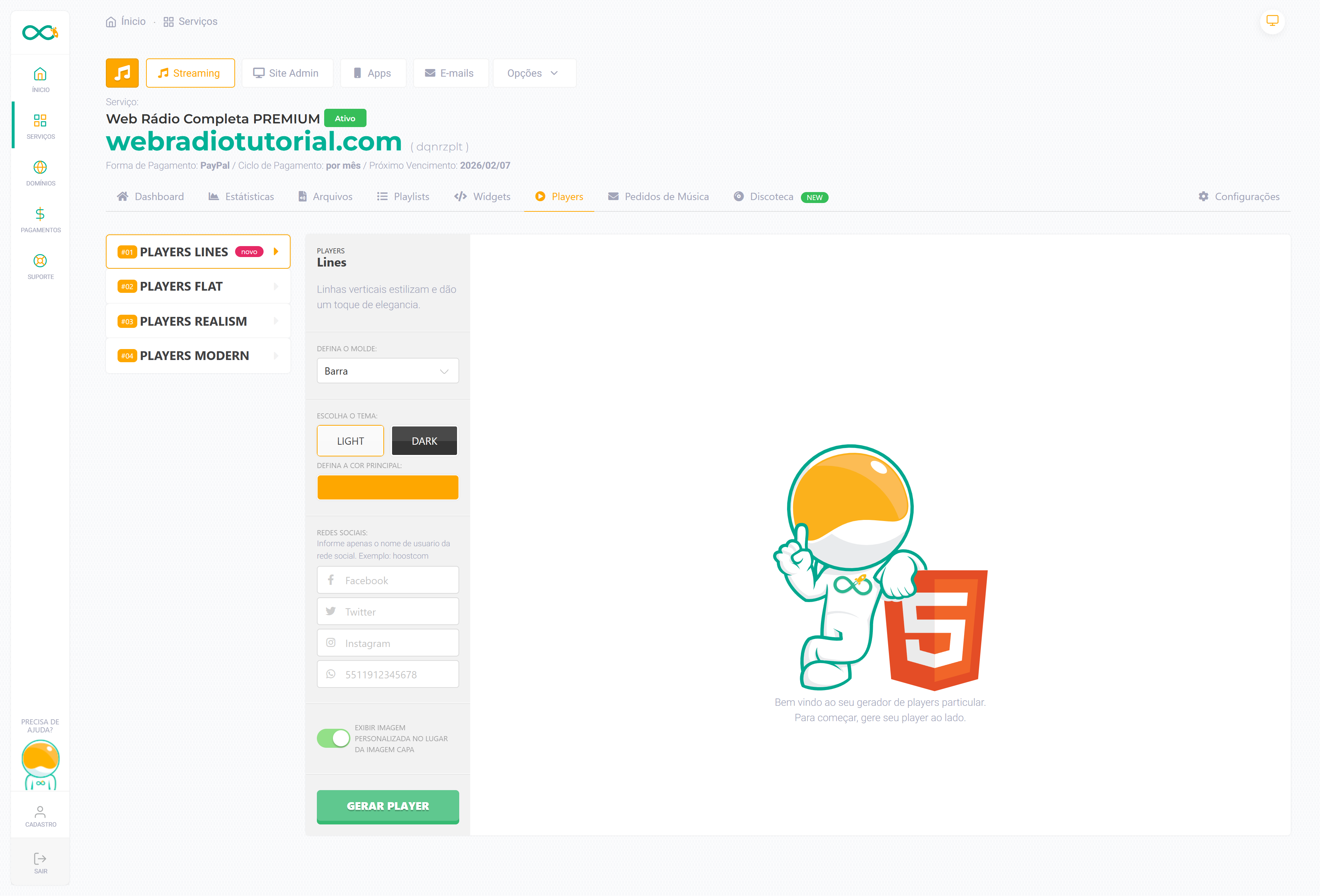 Nessa área você poderá gerar players customizados para seu streaming.