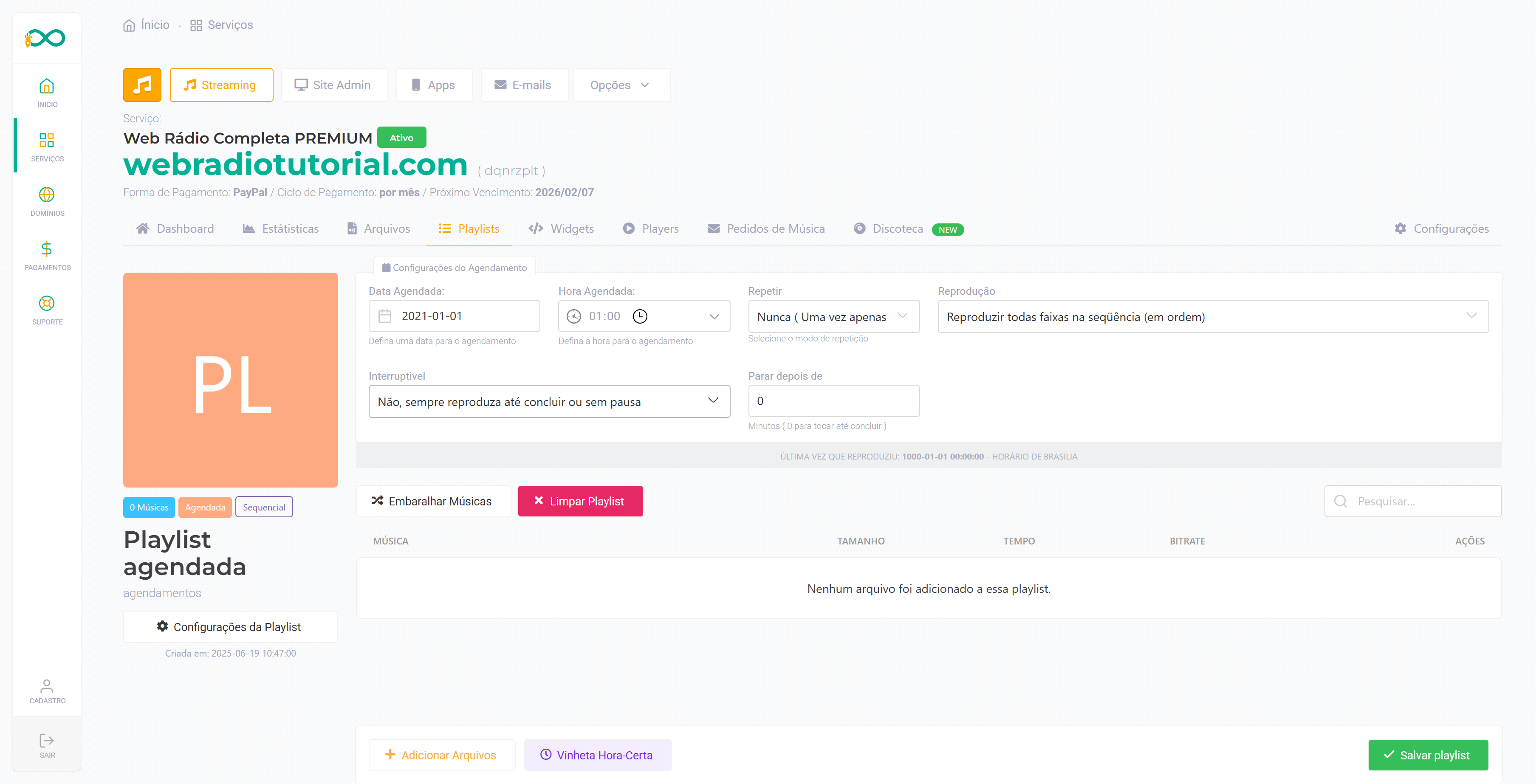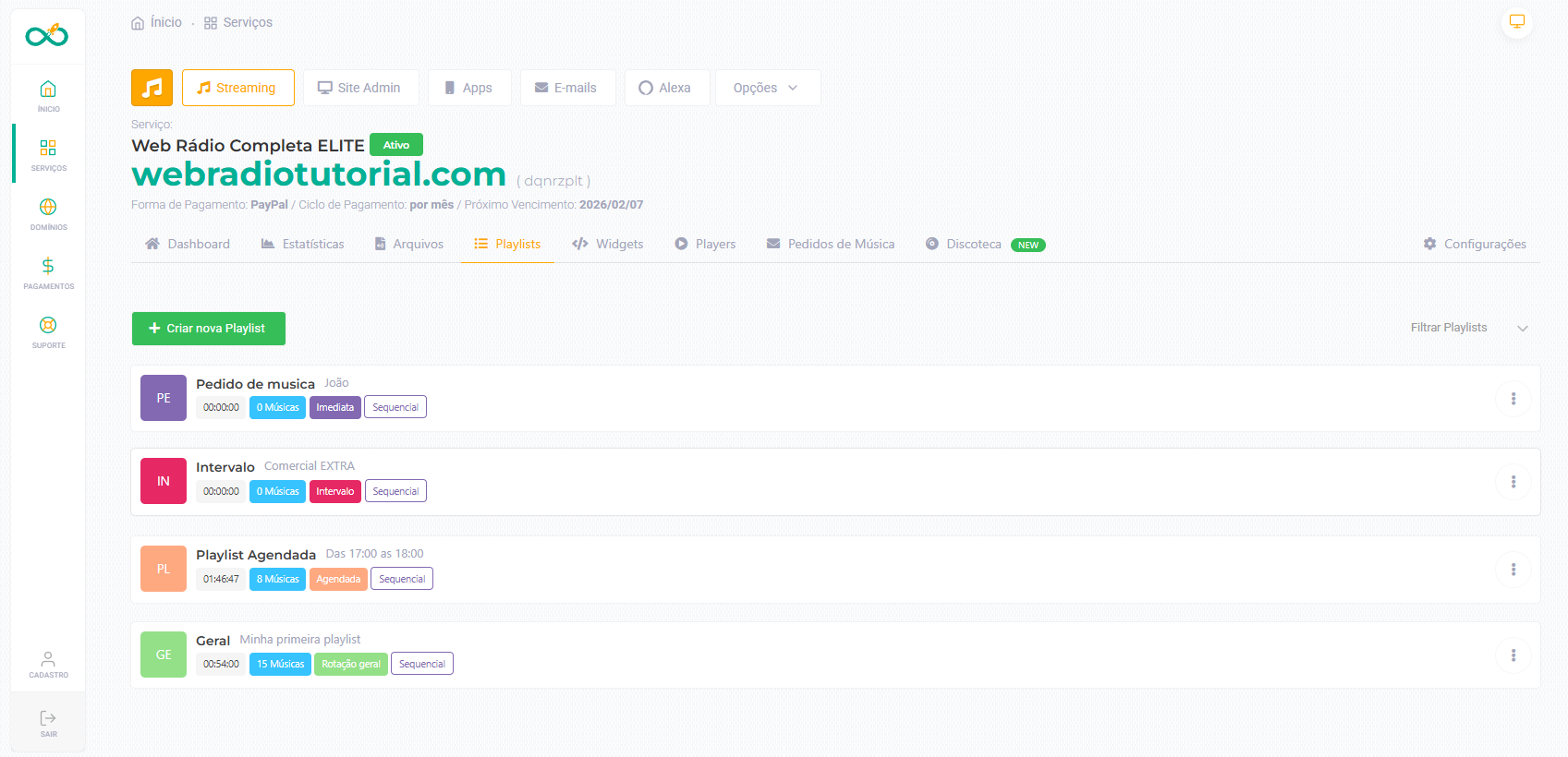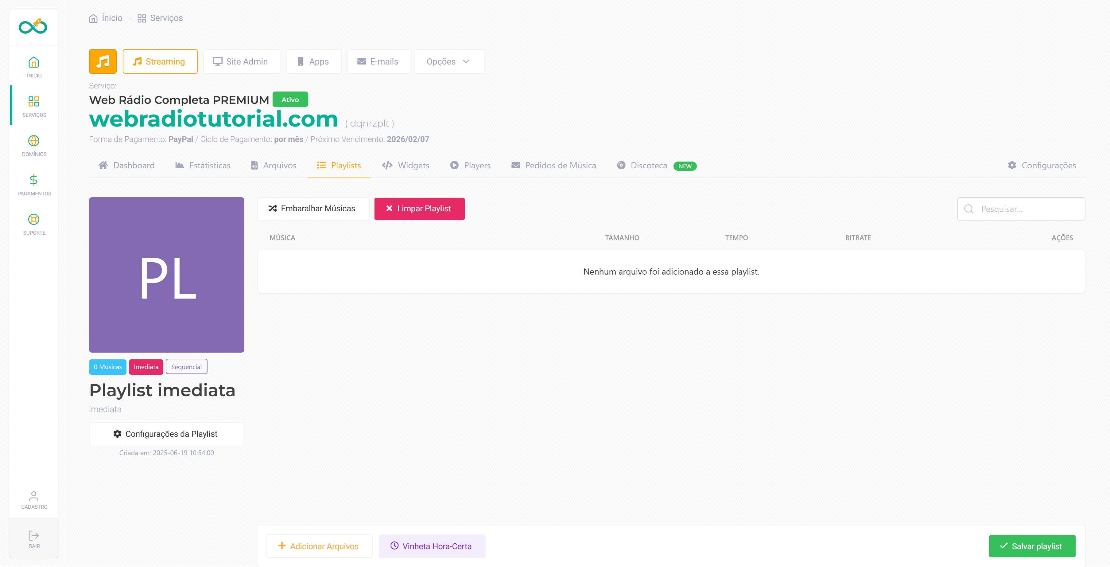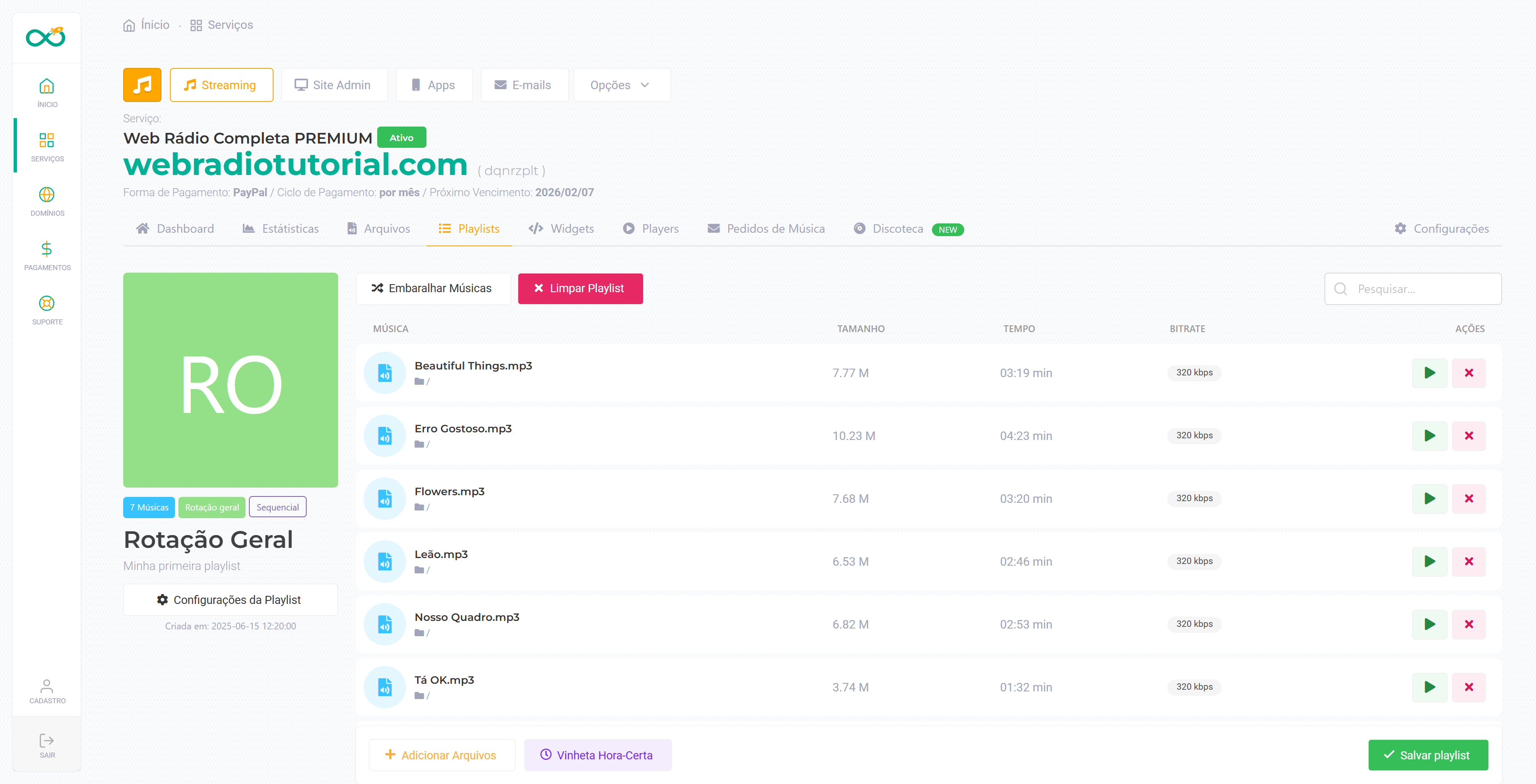 Nessa área você pode criar, excluir e gerenciar as playlists para seu Auto DJ.