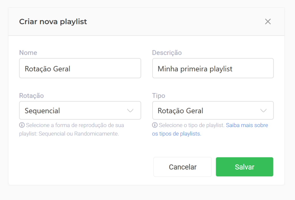Clique no botão Criar nova Playlist. Uma janela será aberta com os seguintes campos: