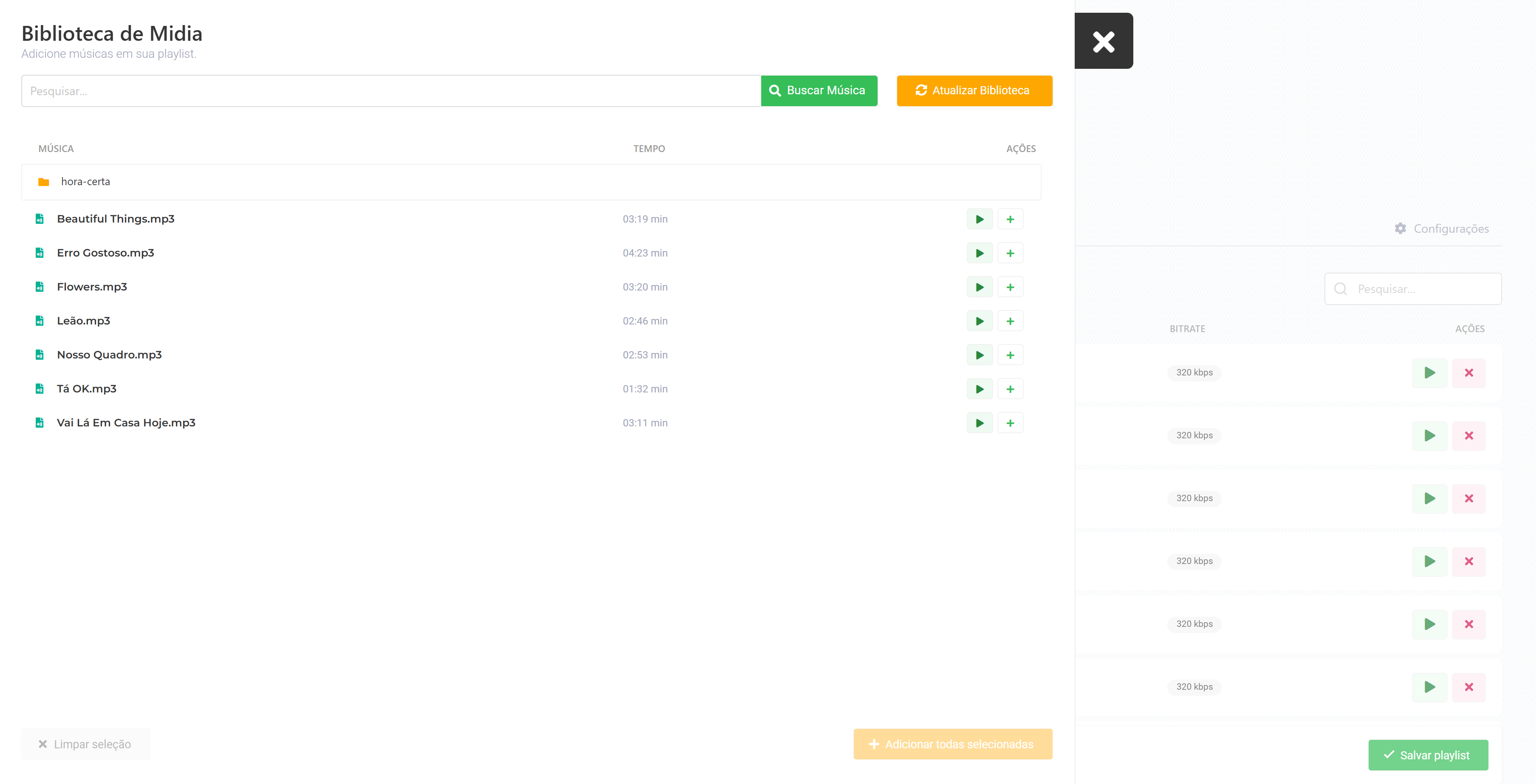Dentro de uma playlist, você pode adicionar músicas usando o botão Adicionar Arquivos.