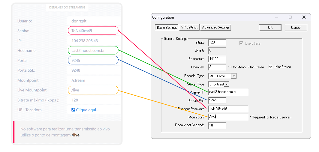 Ainda no painel do serviço, tenha em mãos os dados de transmissão: