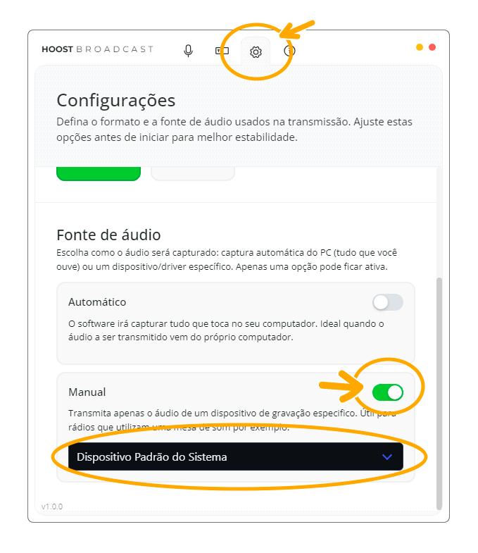 O Hoost Broadcast já vem configurado para capturar automaticamente o áudio do computador, sendo ideal para a maioria dos usuários.