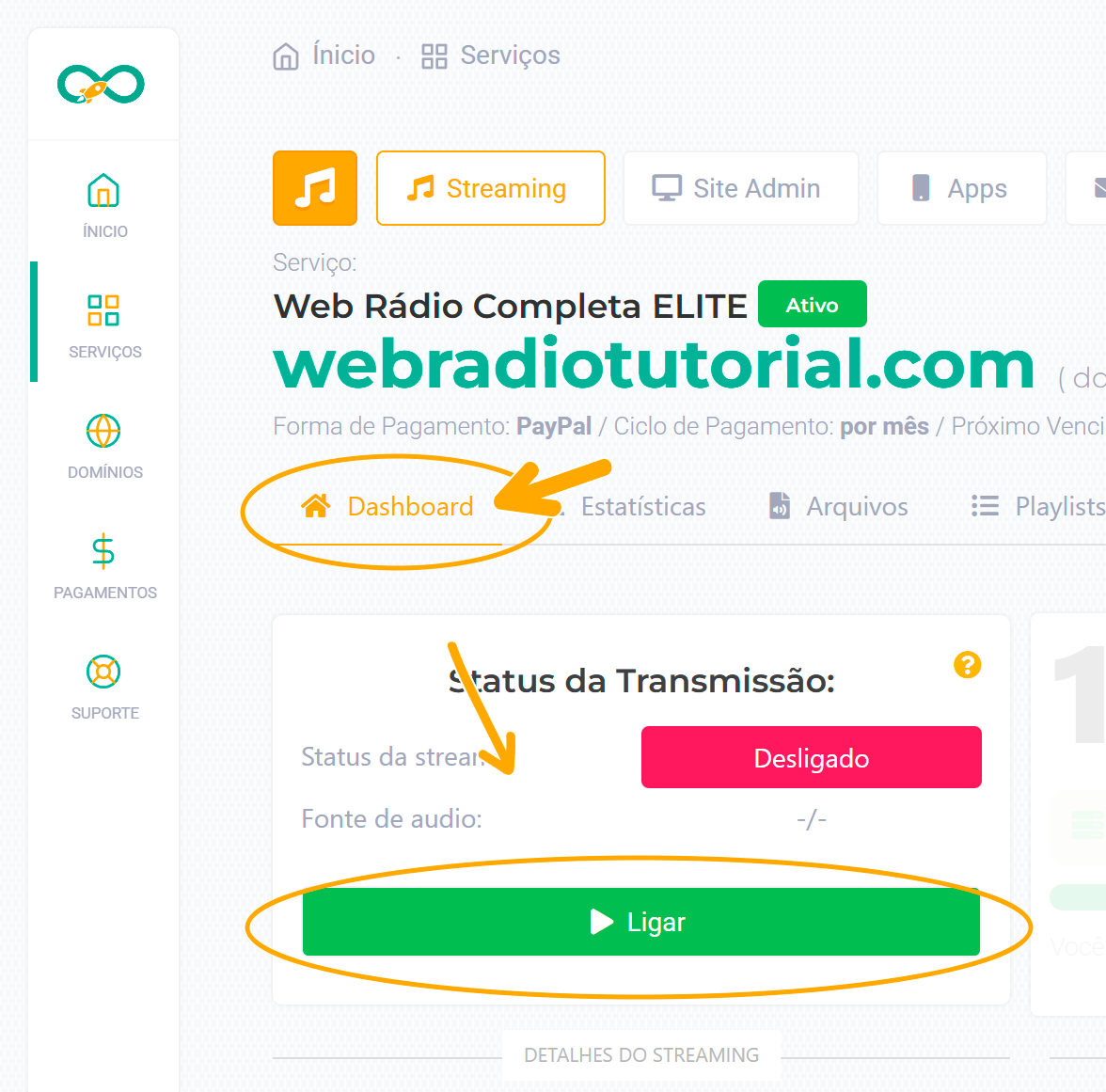 Volte ao Dashboard e clique no botão LIGAR para iniciar sua stream.